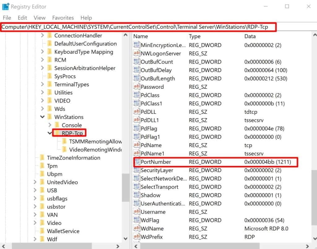 Navigate to “Computer\HKEY_LOCAL_MACHINE\SYSTEM\CurrentControlSet\Control\Terminal Server\WinStations\RDP-Tcp” and right-double-click on “PortNumber “.