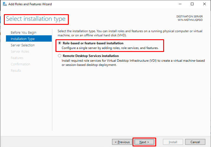 - In the Select Installation Type page choose Role-based installation and click on next.