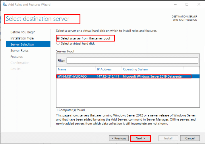 - On the Select Destination Server page choose the destination server and click on next.