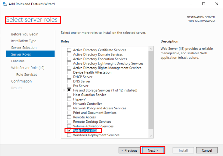 - Select the Web Server(IIS) role and click on next.