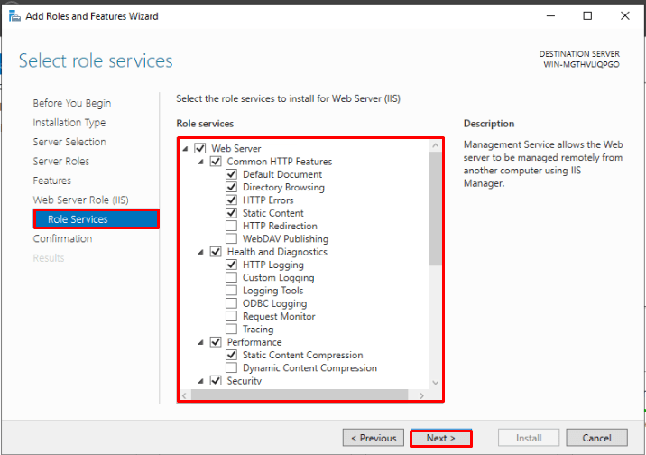 - On the Role Services page choose the services which you want to be installed with your Web Server.