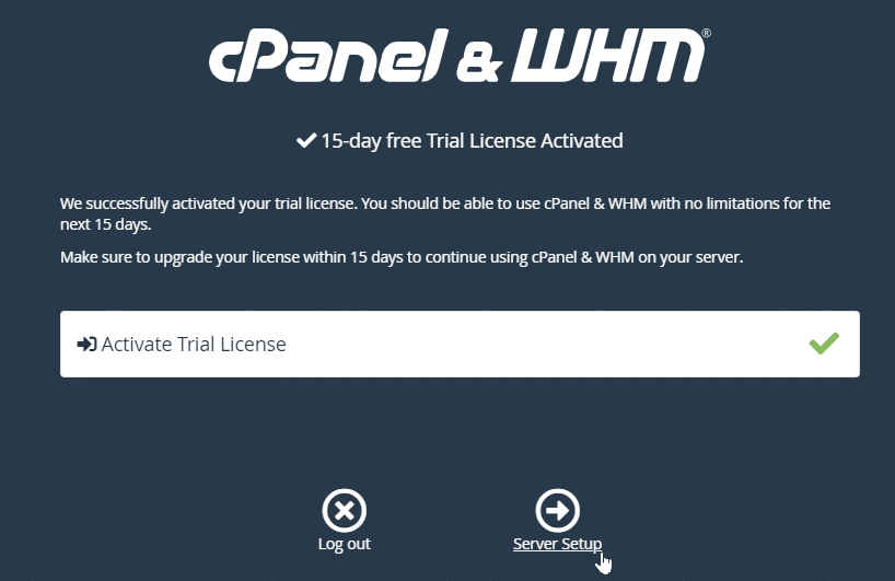 After that, sign in with your registered cPanel login to activate the 15-day free Trial License. Now click on server setup.