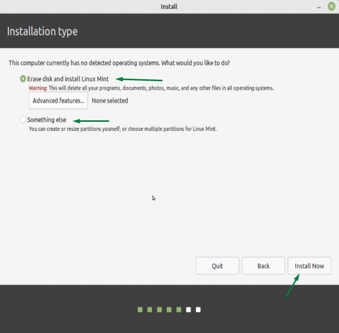 - Now you have two options for desktop installation: you can erase the whole disk for desktop installation or select the second option to manually create partitions for your installation.
