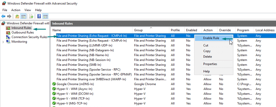 - In the Windows Firewall, select Inbound Rules and look for “File and printer Sharing (Echo Request – ICMPv4-In)”. Right-Click on it to Enable the rule.