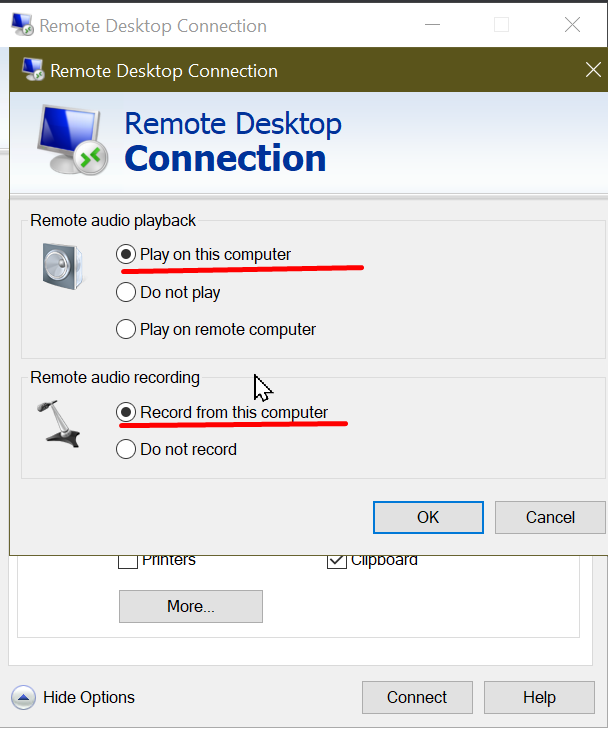 •Open settings for Remote Audio and the select the option for Remote Audio Playback and Recordings for your respective Windows Server 2019 and select the given options.