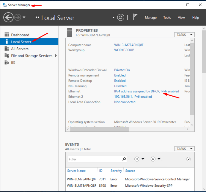 • Sign in to the server, open the Server Manager, go to Local Server, and click on Ethernet: IPv4 address assigned by DHCP.