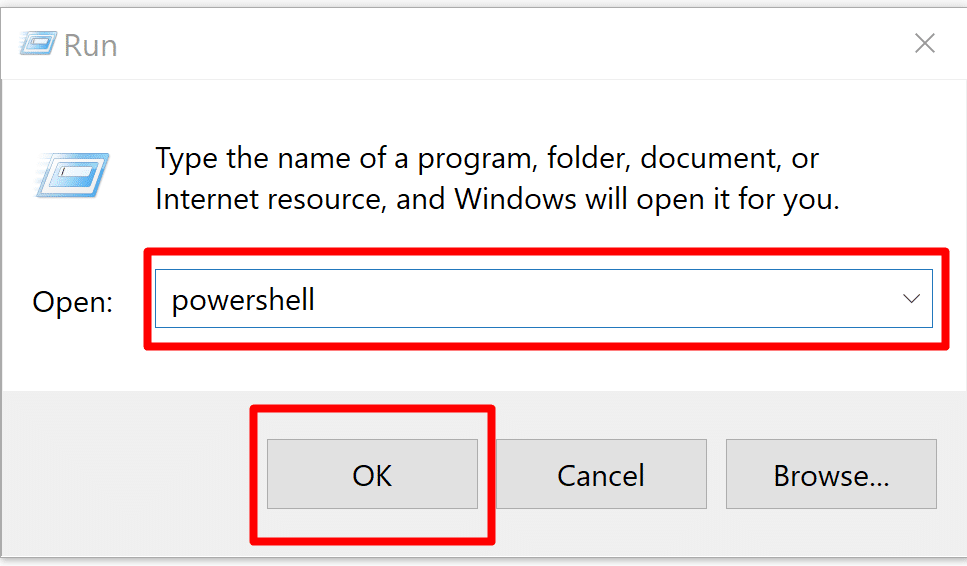 - In the Run prompt (Win + R), Type “Powershell”, and hit the Enter key.