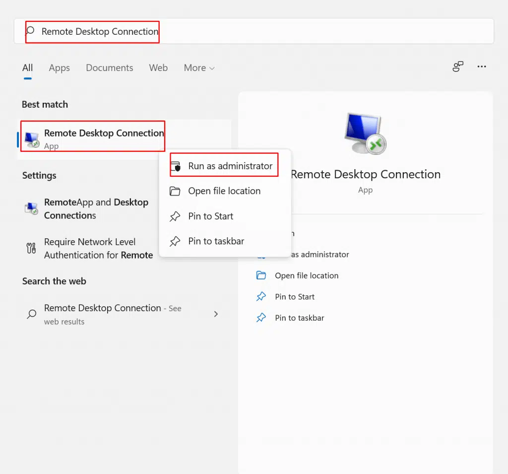 - In the windows search bar Type “Remote Desktop Connection”.