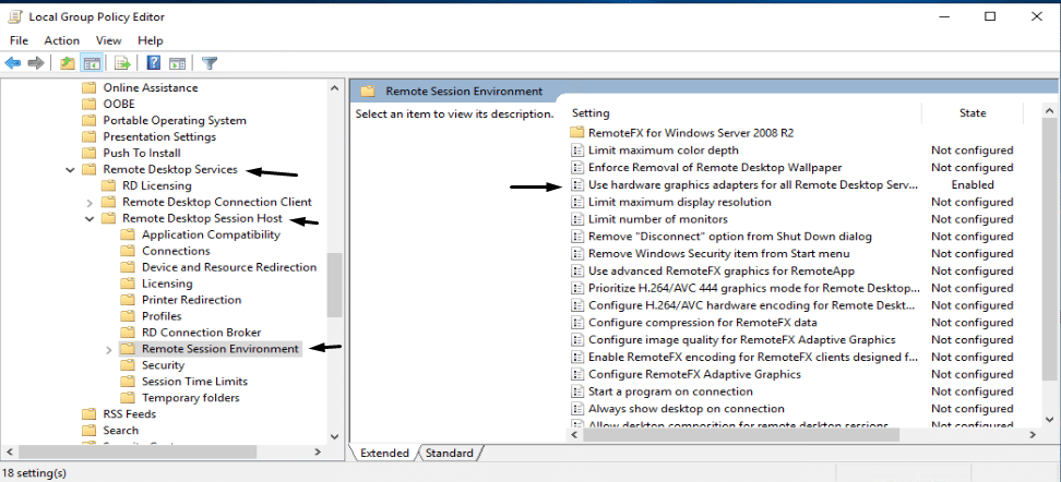 • In the navigation pane, go to the given path. Computer Configuration > Administrative Templates > Windows Components > Remote Desktop Services > Remote Desktop Session Host > Remote Session Environment