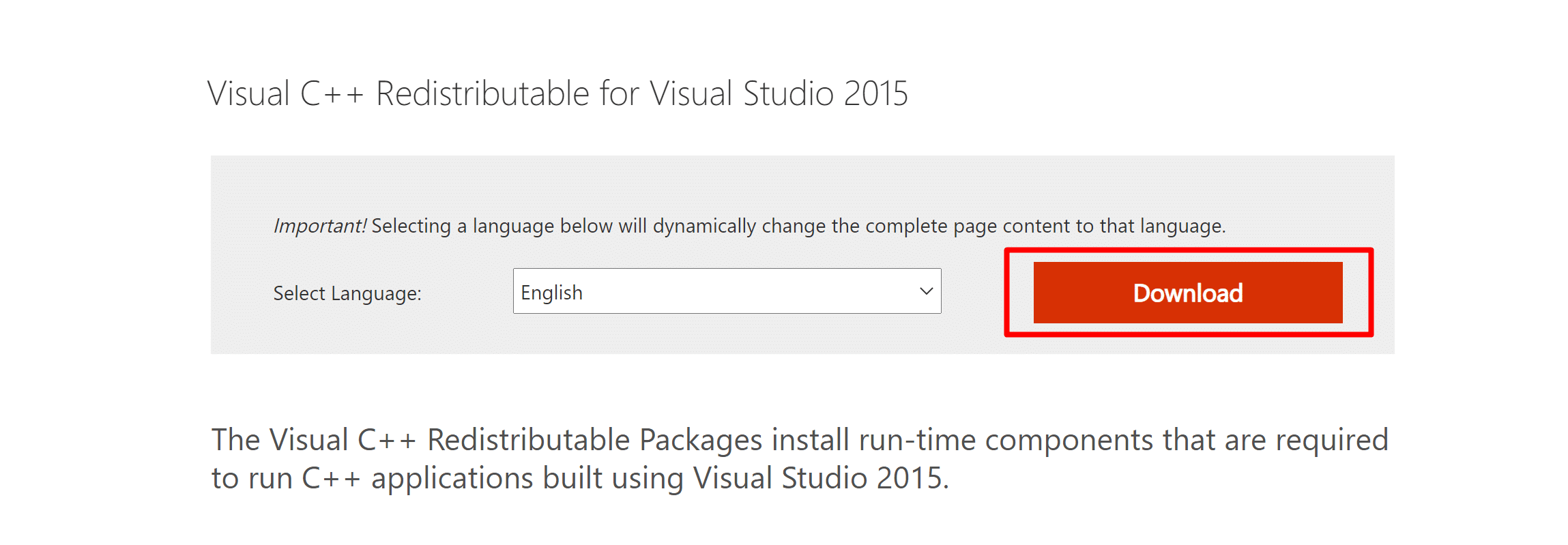 - Go to Microsoft website to the download page for the ” Visual C ++ Redistributable for Visual Studio 2015 ” and click on “Download”.