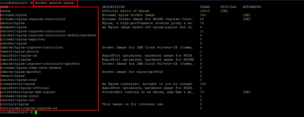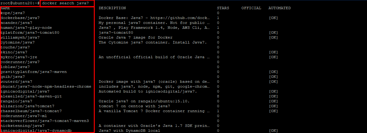 The given command will return all the images that have been configured and uploaded to Docker Hub having all the necessary packages for java 7. Similarly you can modify your search for different tech stack by replacing java7 with your desired keyword. Another example to this, lets search for a web server image on Docker hub. Also do remember that the docker search images is limited to singular argument so do not put a space between your techstack version. If the Official mark is [OK] that means the image is maintained and uploaded by official company that developed the tech.