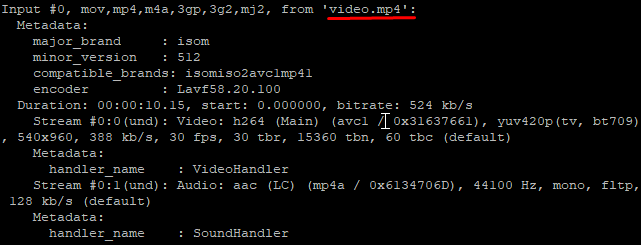 The output will show the information about the file. You can also get the information on any media file using the same command provided above by replacing the video.mp4 filename.