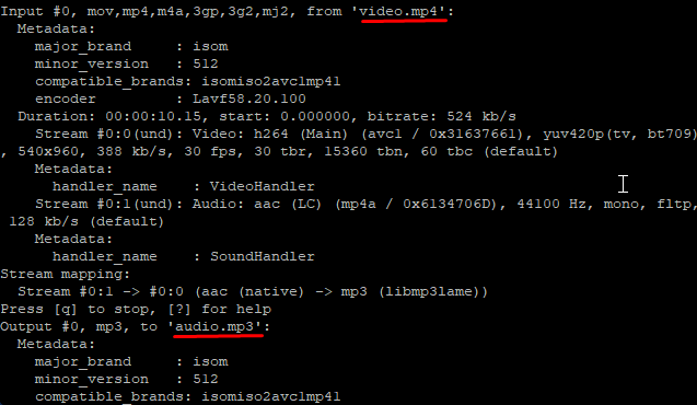 # ffmpeg -i video.mp4 -vn audio.mp3