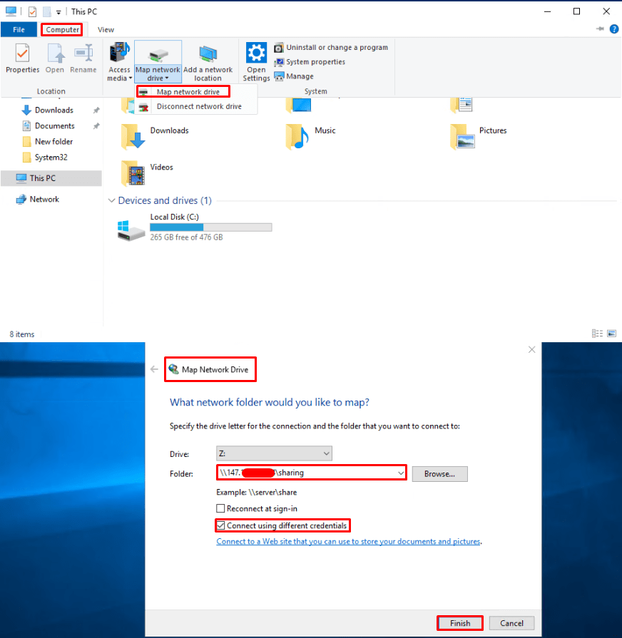 In this guide we will see an example for Windows for Linux and Unix user they have to connect the server and mount the samba directory to the system. In your windows system open This PC/File Explorer and click on Computer>Map network drive. This will open a new wizard, in that enter the server details in the given format “\\SERVER_IP\SHARE” .