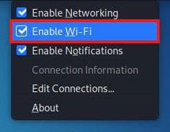 The methods for connecting to WiFi in the KDE, GNOME, and Xfce desktop environments are nearly identical. To enable or disable WiFi in the Kali Linux desktop environment, follow the procedures below.