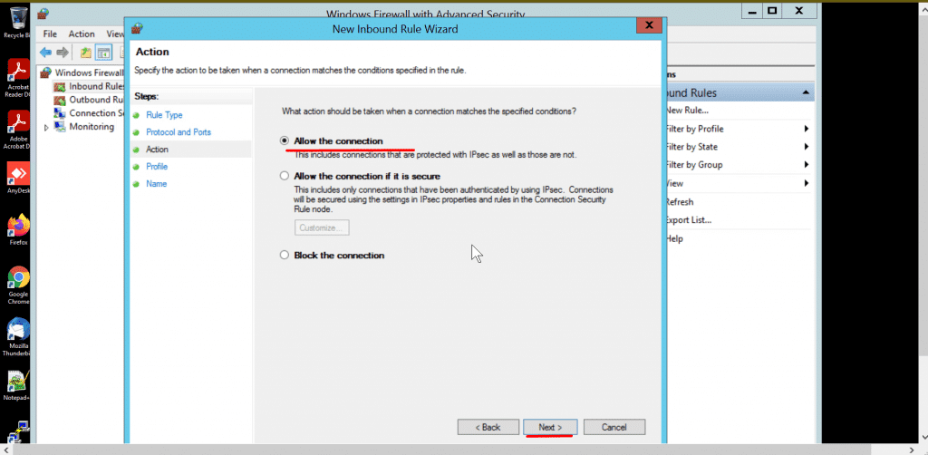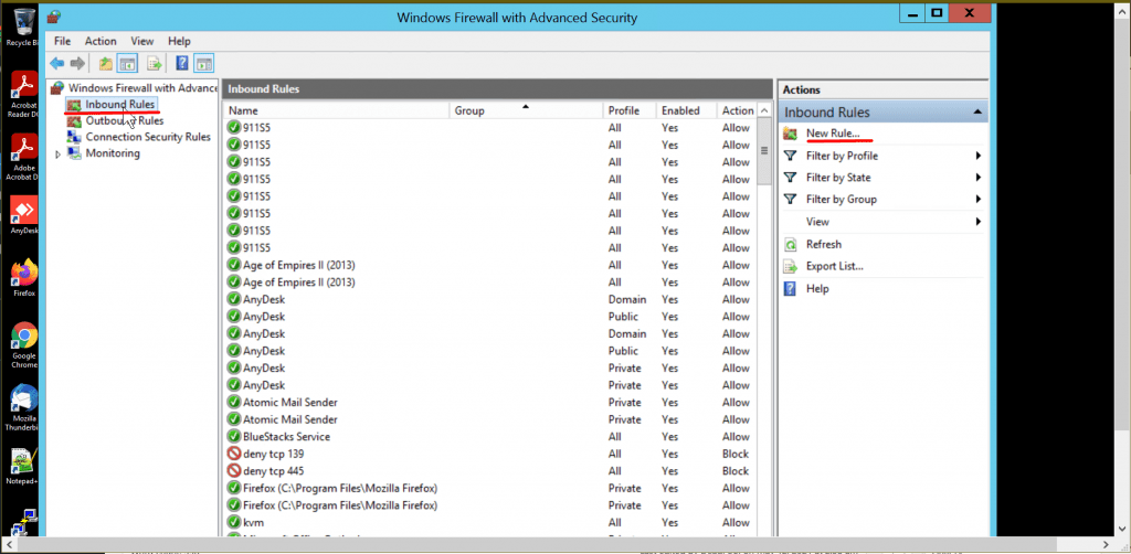 • Now to allow an incoming connection select the Inbound Rule and then click on New rules