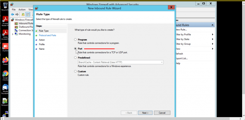 • Now Select your Rule type In this example we are looking to open a port so we will choose Port, click on next