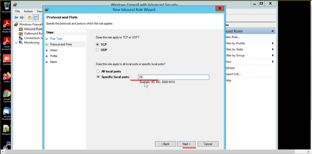 • Choose the connection protocol TCP/UDP based on your requirement, click next. Type in specific port ranges to open or open all remote ports,  In this case, We are opening port 25 so we will go with a specific local port selection. Type the port number. In our case, it will be 25.