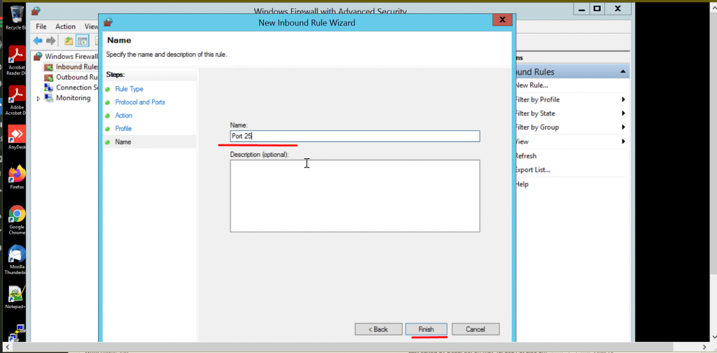 • Click on next specify a name for your rule (port 25). Name your Rule something. Click Finish.