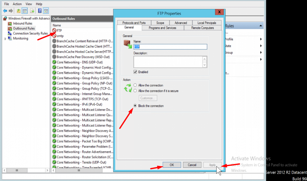 • Click on Inbound Rules or Outbound Rules, depending on what type of rule you created. In our case, we will disable an Outbound port for FTP. Choose the rule you created. Now in the dialogue box mark block the connection option. Click on apply and tye OK. This will close the Outgoing connection for Remote Port 21.