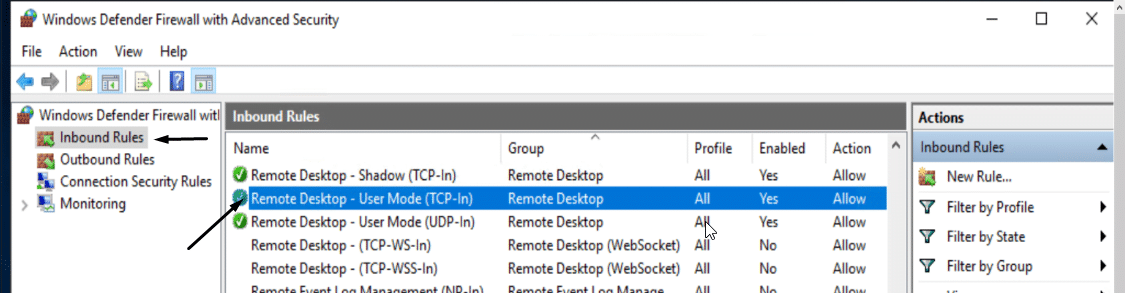 - Select Inbound rules and look for the “Remote Desktop – User Mode (TCP-In)” rule.
