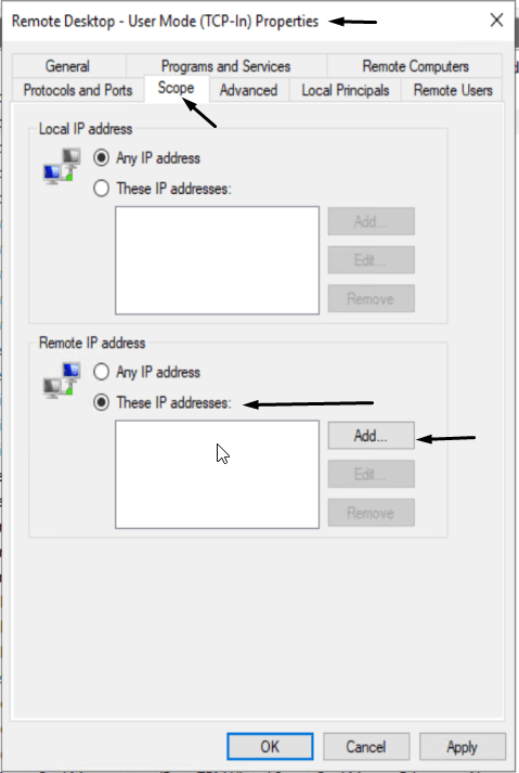- Under “Properties” click on “Scope” within the “Remote IP Addresses” select the column “These Ip Addresses” then click on “Add…”.
