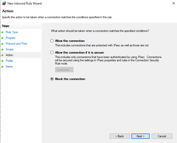 Now, in the Action field, you will have to choose the ‘Block the Connection’ option to block all the access of this IP in the Windows Firewall.