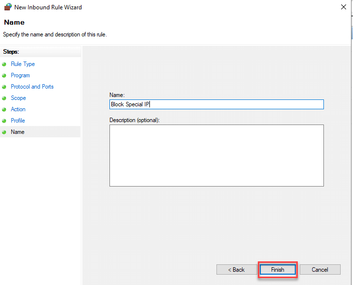 New-NetFirewallRule -DisplayName “_Block Rule” -Direction Inbound –LocalPort Any -Protocol TCP -Action Block -RemoteAddress IP1, IP2, IPX.
