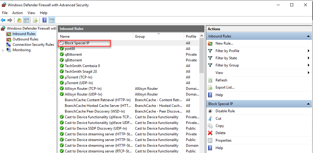 Once you click on ‘Finish,’ you’ll be brought back to the original window, and you’ll notice that a new Inbound rule has been added to the list.
