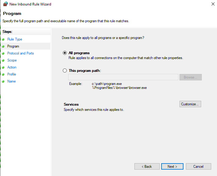 With the next field, you can either choose ‘All programs’ (Recommended), or if you desire to block only a specific program path, then you can select the other option as well.