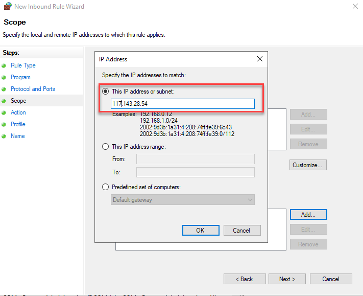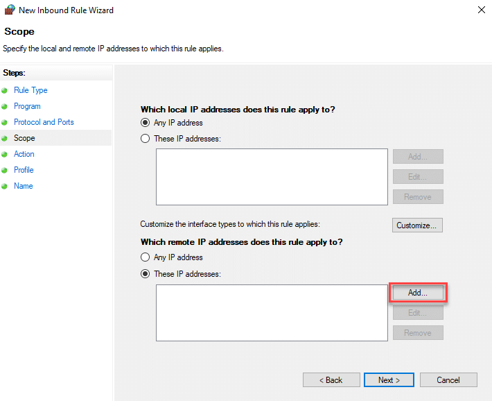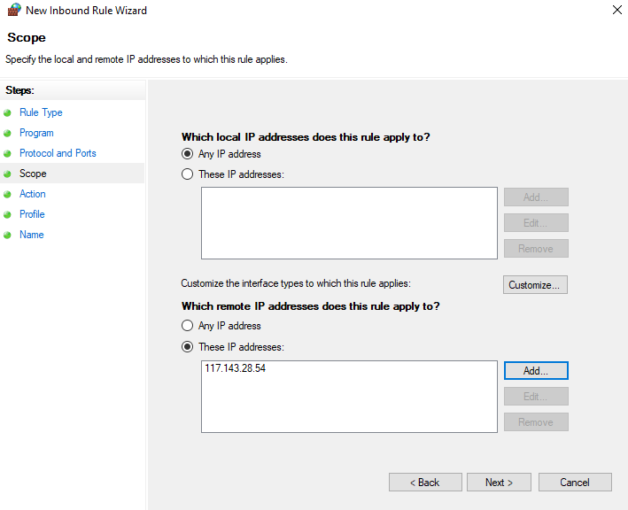 Within the Scope filed, you’ll have to select the highlighted ‘Add’ option (in the below screenshot) for the question ‘Which remote IP addresses do this rule apply to?’