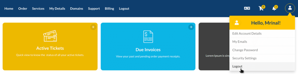 • Click on the top-right account icon, and hover your mouse to LOGOUT, and click. The Customer Portal will log you out: