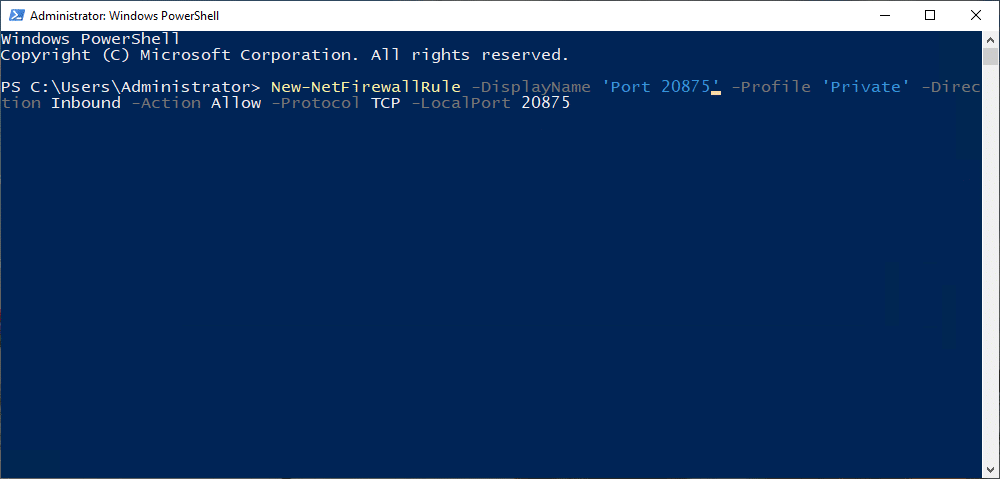 <code>New-NetFirewallRule -DisplayName “Port 20875” -Direction inbound -LocalPort 20875 -Protocol TCP -Action Allow
