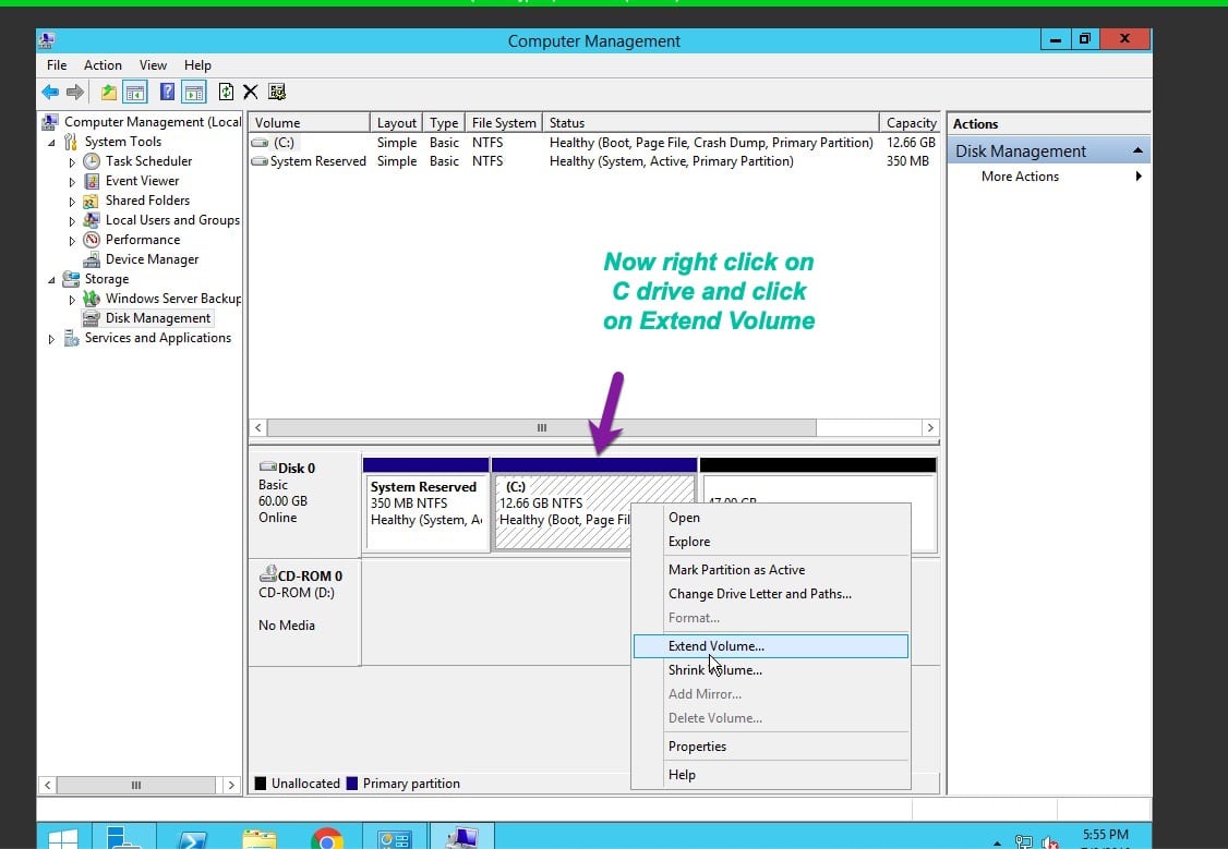 Last Step: Now we will use this unallocated space to extend our C drive, Right Click On C drive and Click on Extend Volume