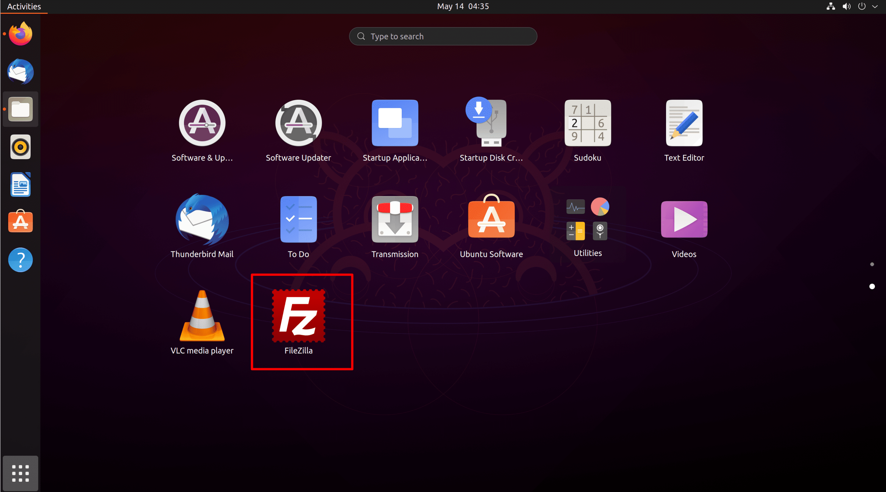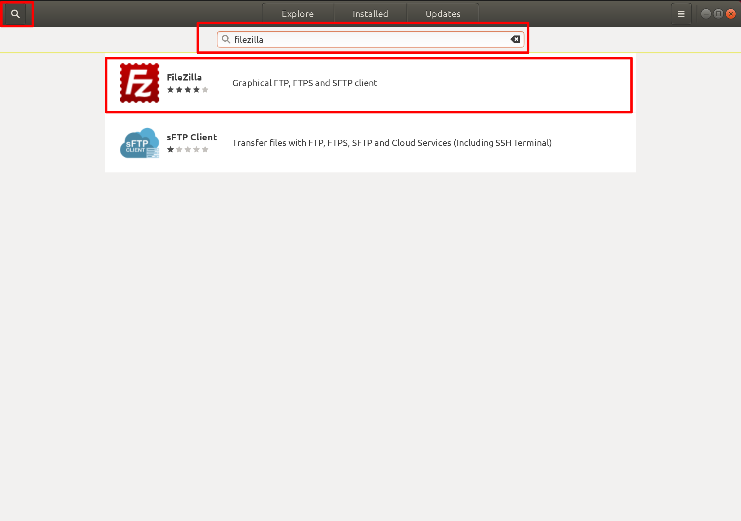 - Now click the Search icon available in the top-right position of the window. In the Search box, search the term FileZilla.