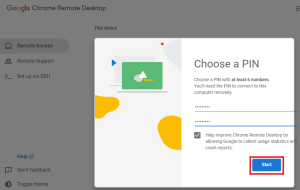 First, after running Chrome, go to the Chrome Remote Desktop page. Open the Remote Access page to log into your Google account (this is the same Google account you used to set up). Do not log in to the computer that is listed as “This device”; instead, use a different host computer. Enter the PIN you previously selected on the host computer to launch the remote session.