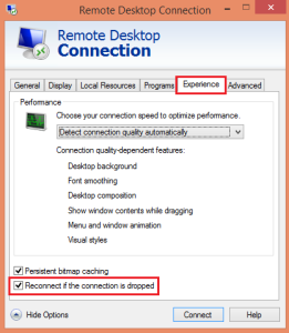 3 . Click on the Experience Tab and make sure the “Reconnect if the connection is dropped” option is selected.